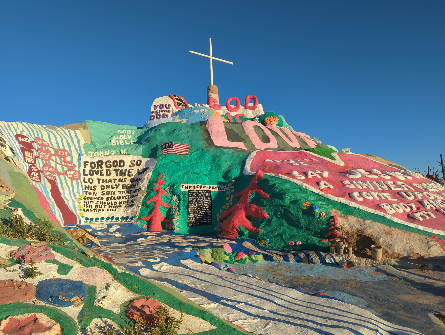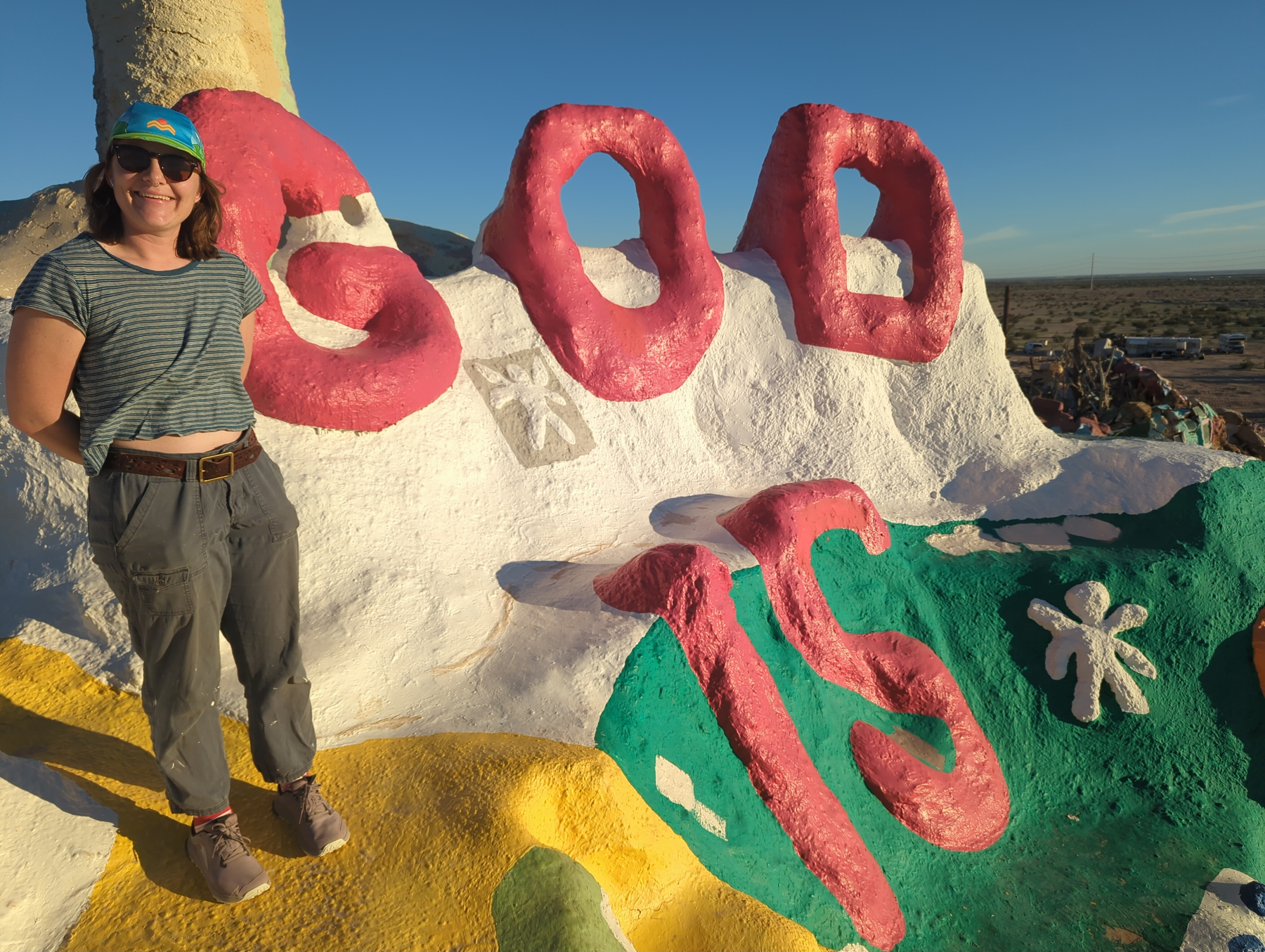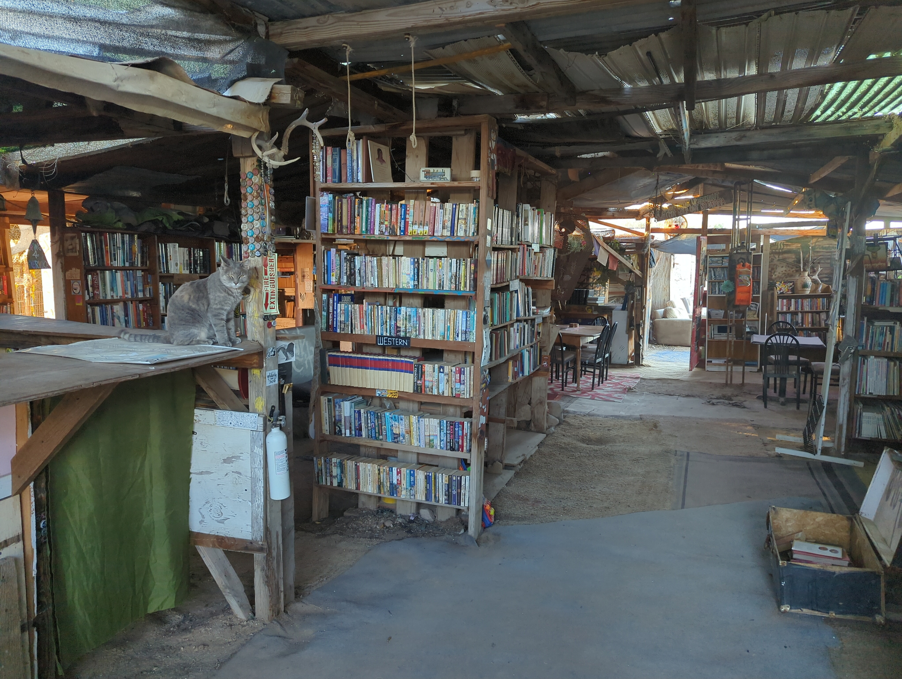 We stopped at the iconic Salvation Mountain – a towering, colorful hill of clay and paint – before driving deeper into the Slabs. Past post-apocalyptic sculptures, we found the community library. There we met Jeff, the librarian, and a friendly resident cat. In the spirit of their take-a-book, leave-a-book system, I swapped an almanac of the California deserts for a fan-fiction book about David Lynch’s old show Twin Peaks.