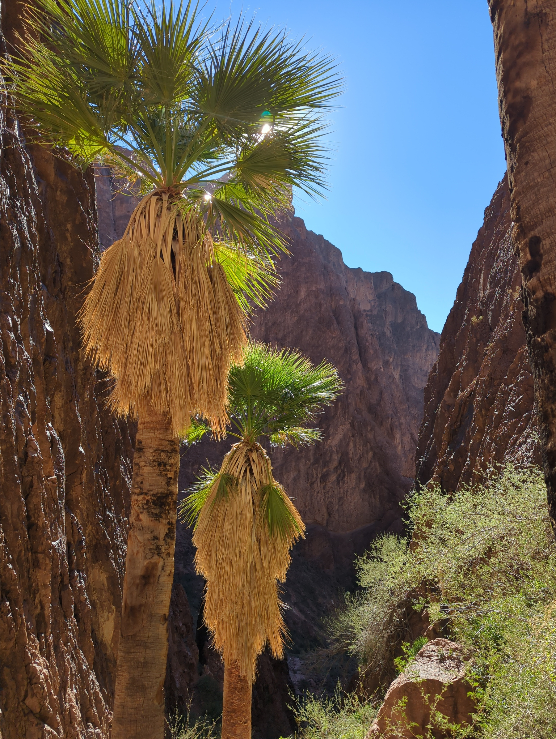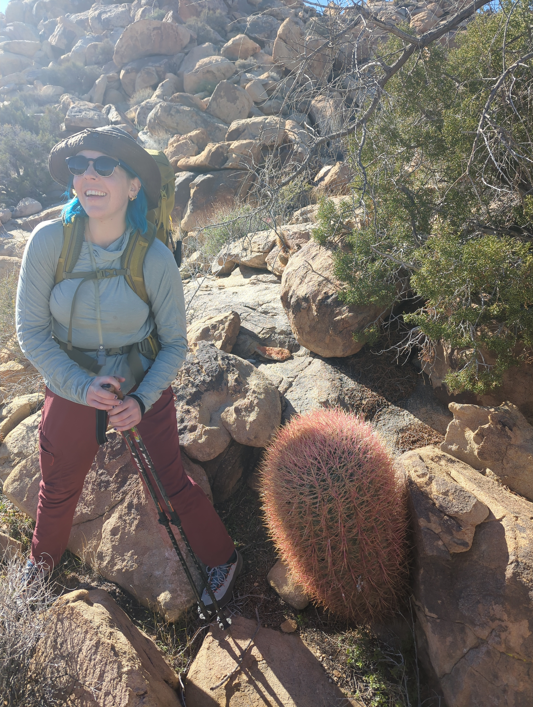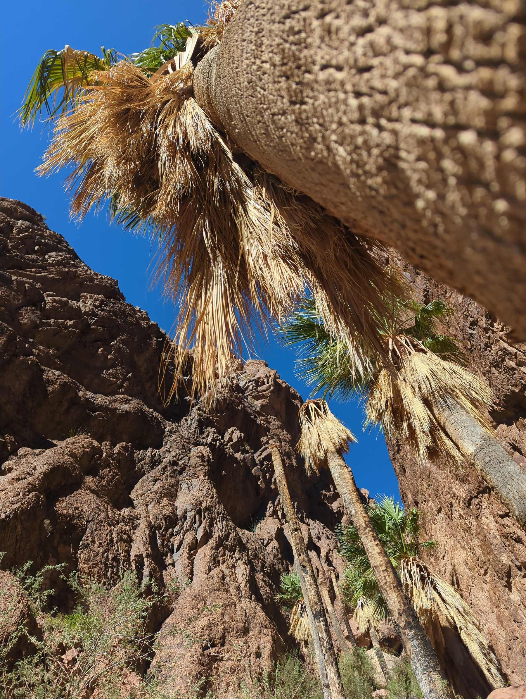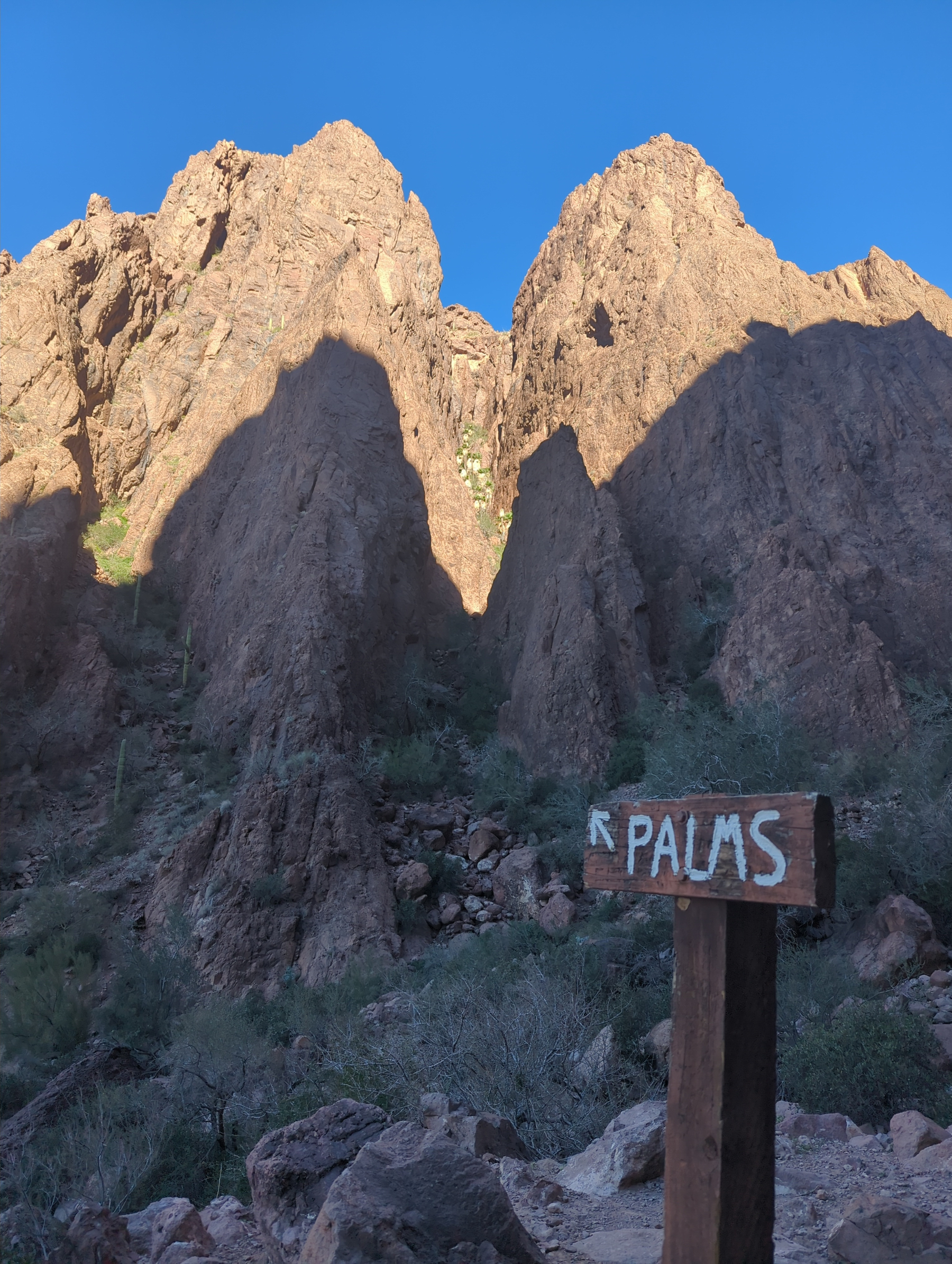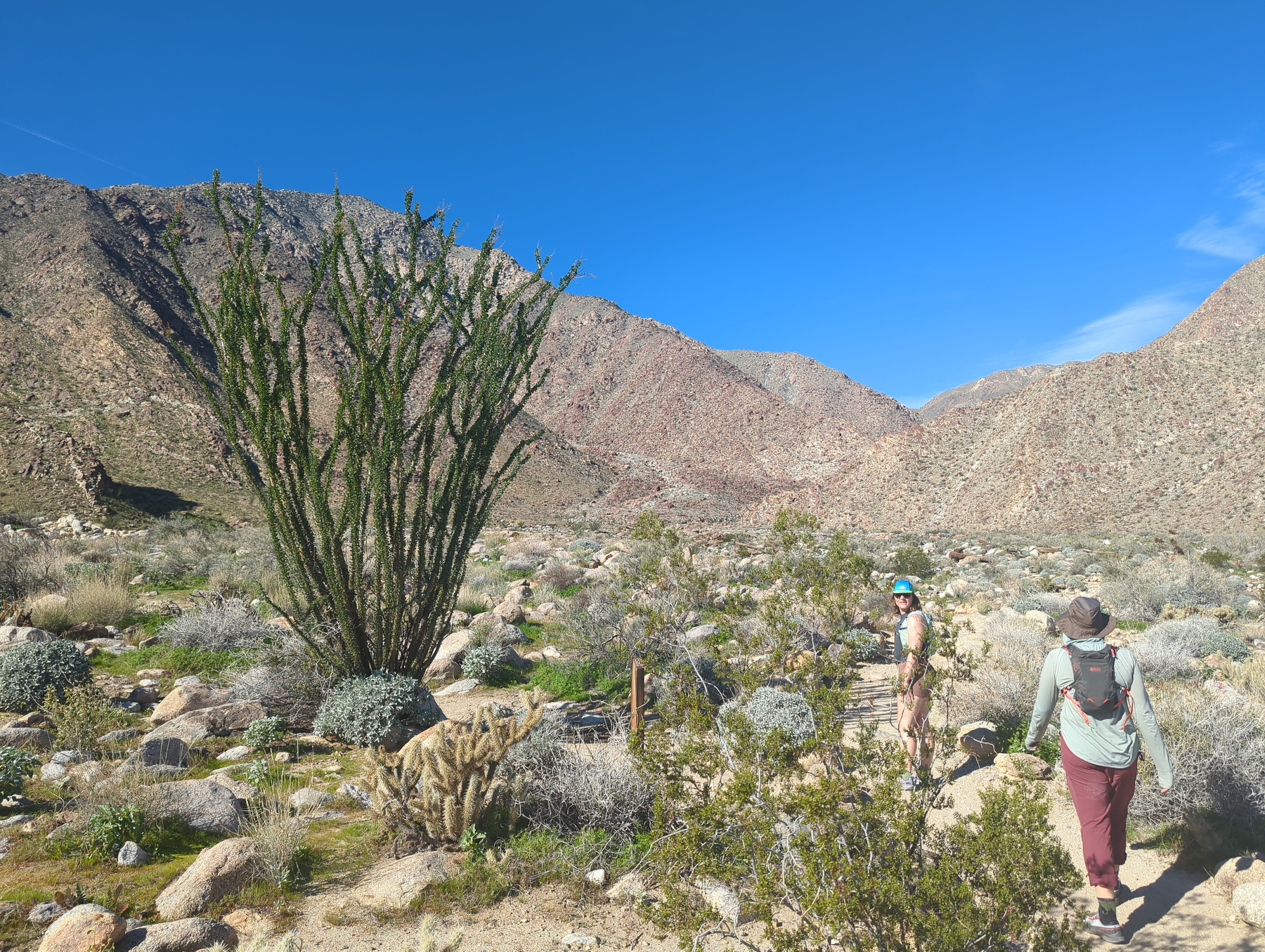 The hike took us through a wide mountain valley teeming with ocotillo, cholla, barrel cacti, and prickly pear. Though the trail was hot and exposed, the payoff was magical: a true desert oasis of palm trees, lush ferns, and green grasses sprouting around a clear creek with waterfalls and boulders. We scrambled through the palms for a while before making the descent back to the van.
