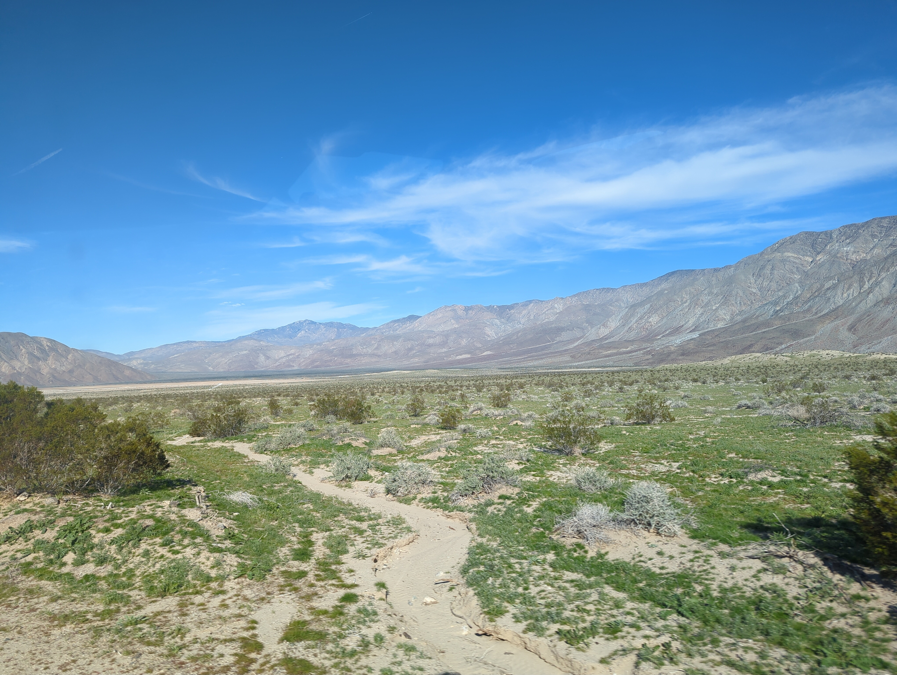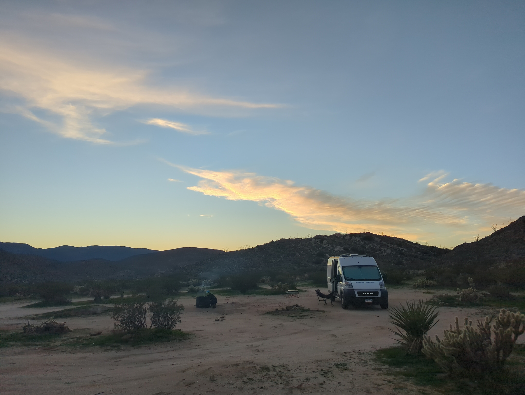 We spent the evening driving toward Blair Valley, a dispersed camping area surrounded by promising trails. The drive was epic, offering vistas of wide valleys and dense patches of barrel cacti. To our surprise, the valley floor was carpeted in vibrant green grass. We found a secluded spot in the foothills just before sunset, the nicest spot on the trip so far, ending the day with a quiet fire and a good book.
