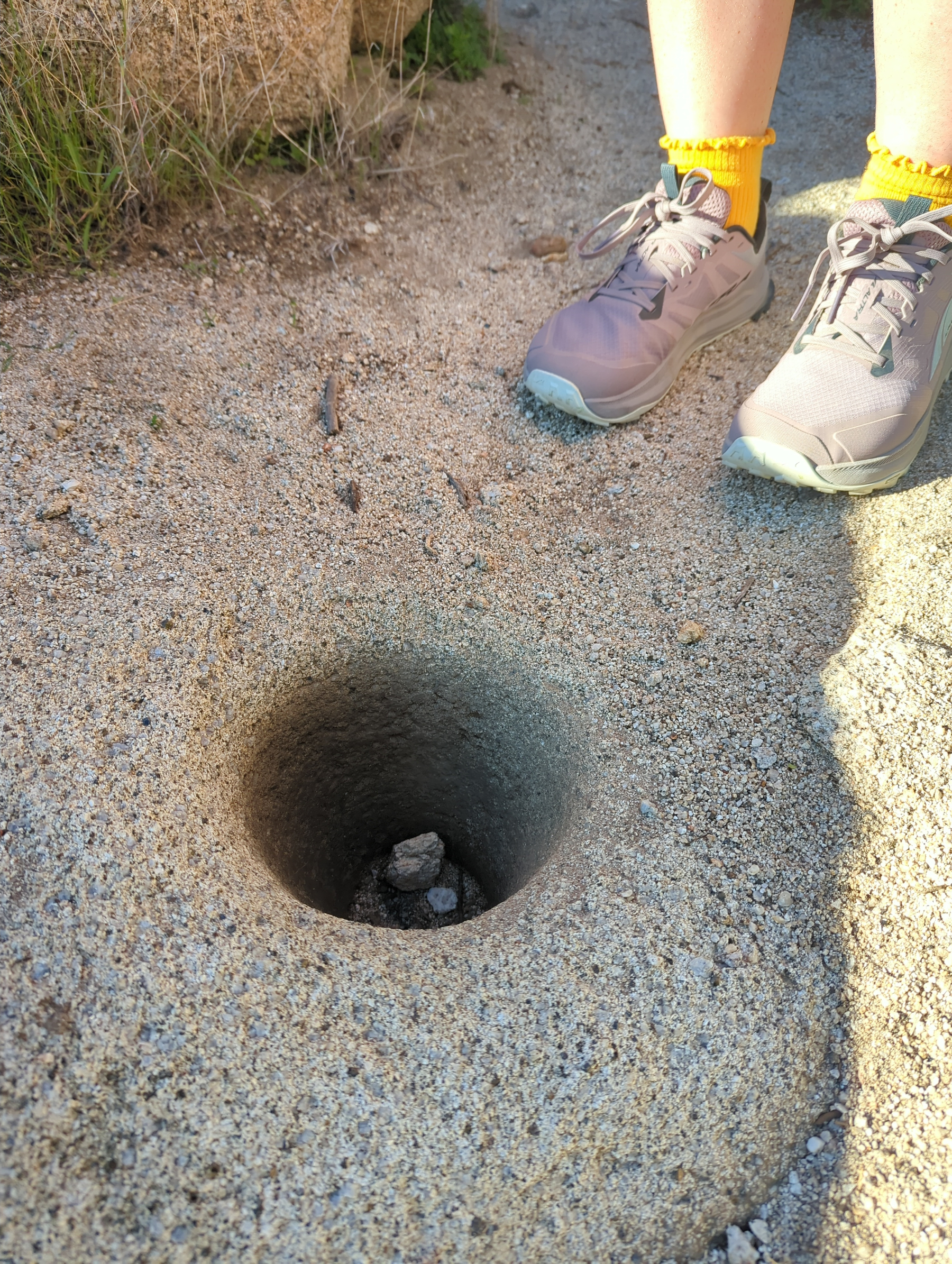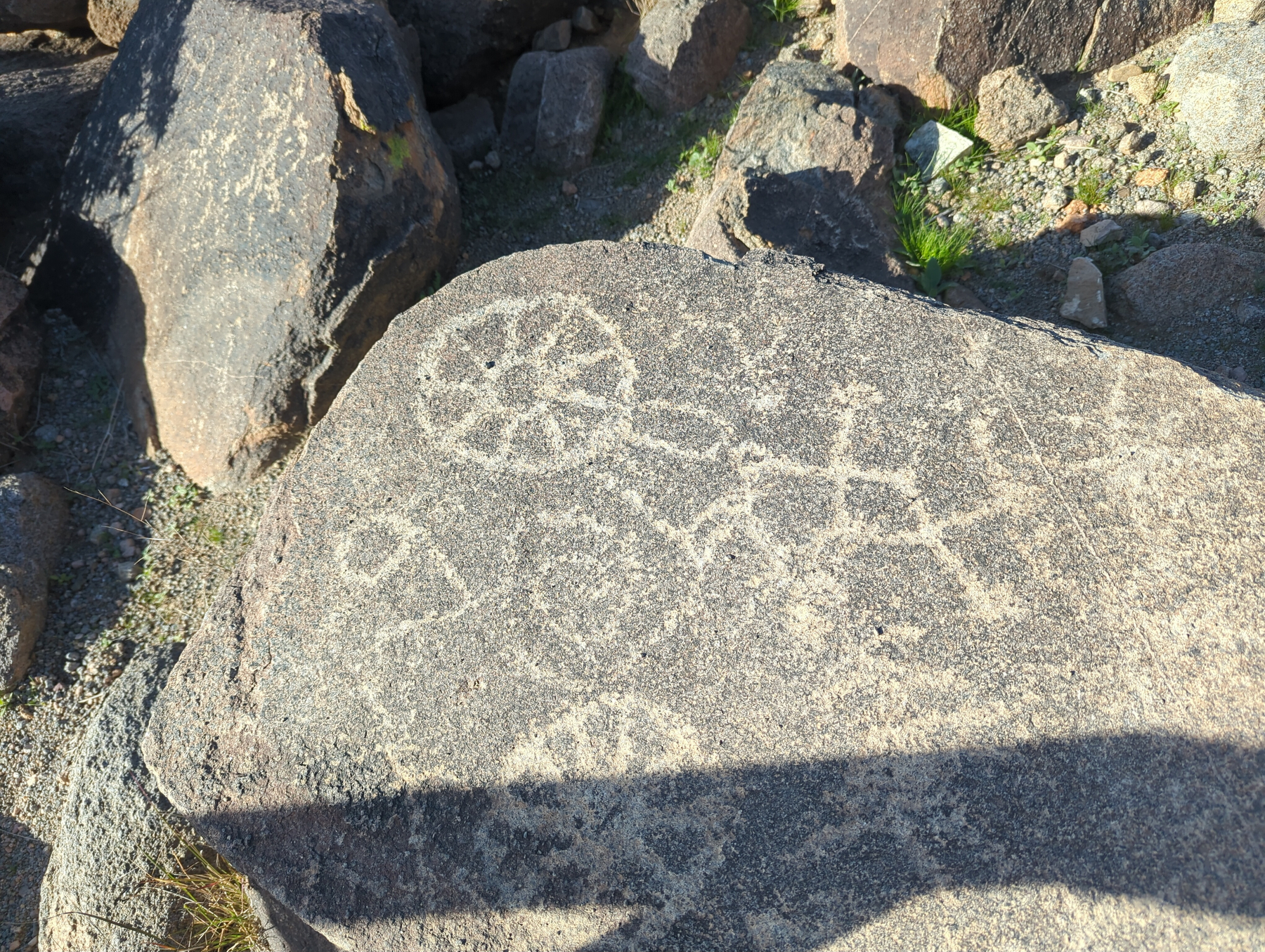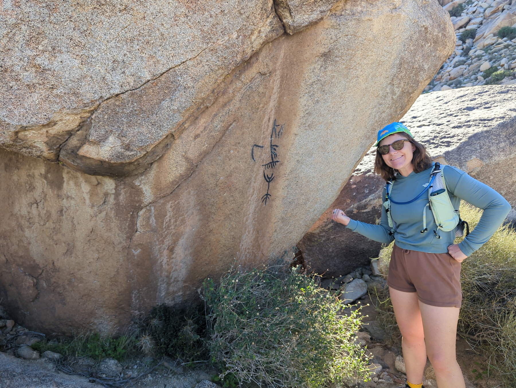 Blair Valley is a corner of Anza-Borrego rich with cultural history, and we spent the morning visiting of view of its sites. After a warm night, we enjoyed our coffee and hiked directly from our campsite into a peaceful gulch. We eventually found the morteros, ancient grinding holes worn into the stone by people who lived here long ago. Nearby, we discovered rock art of a much different style than the petroglyphs we’ve seen in Southern Utah.
