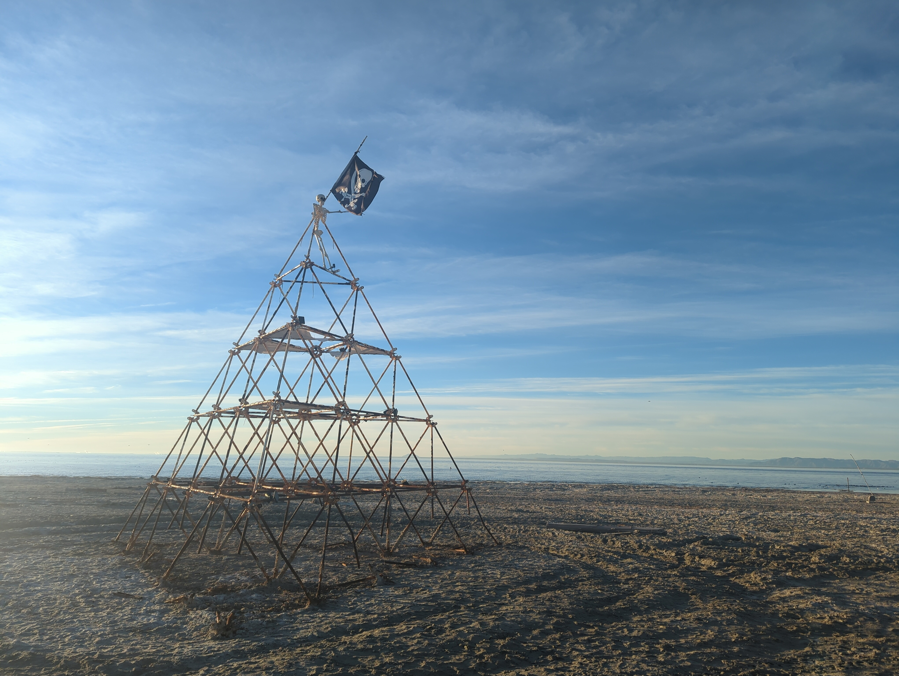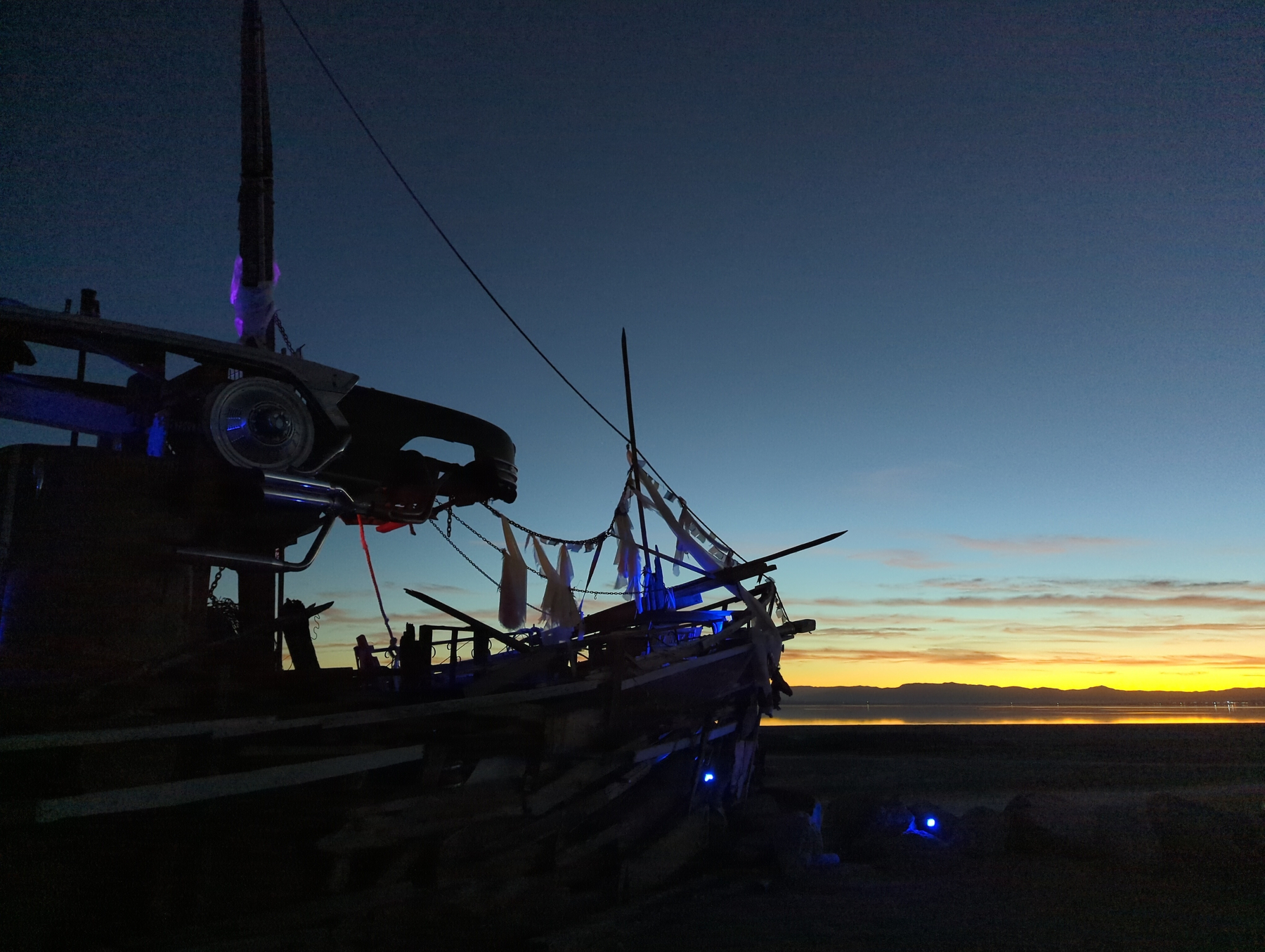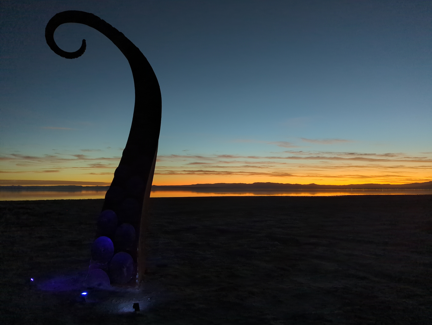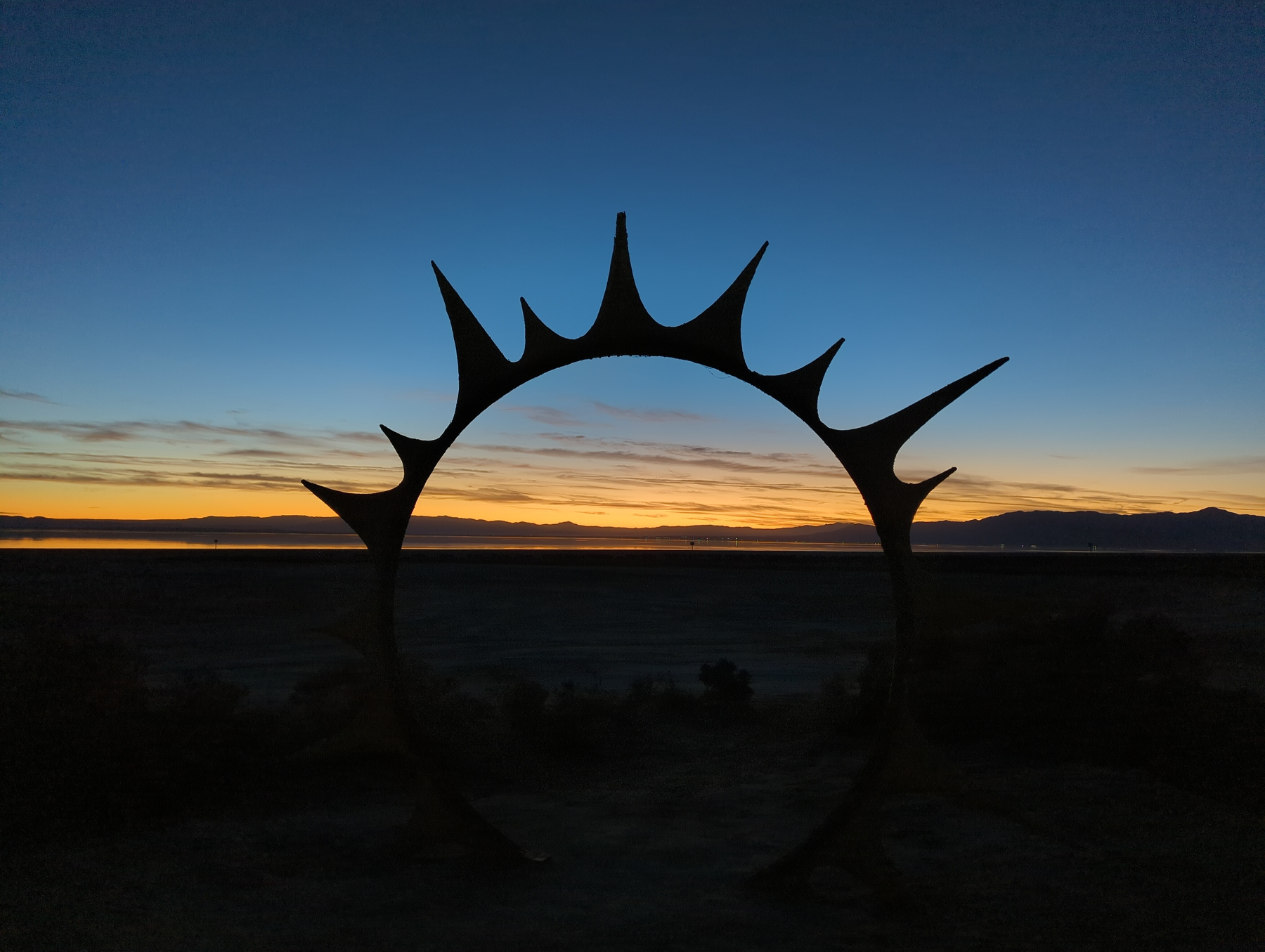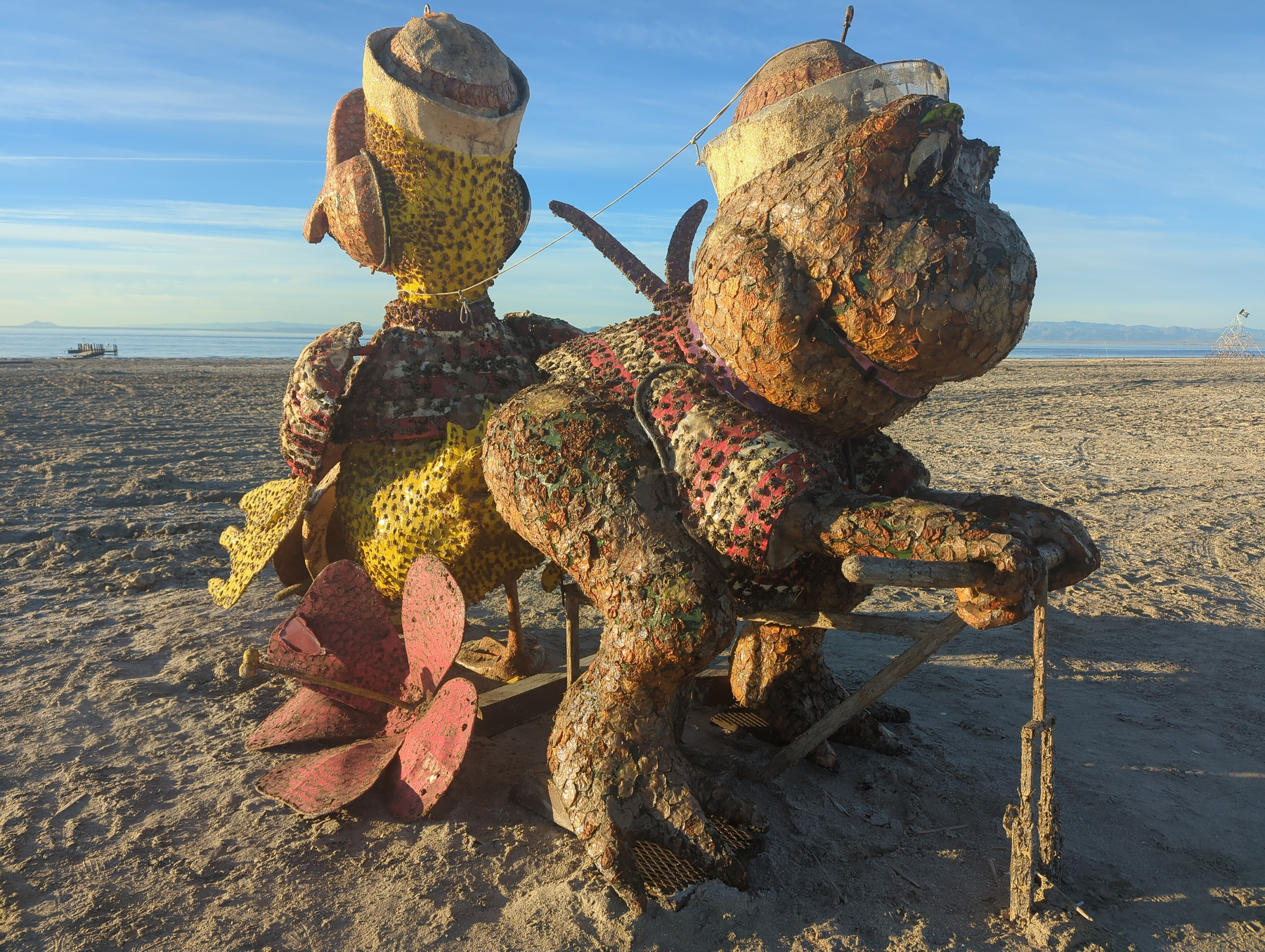 We caught a glimpse of the sculptures at dusk before heading to the Ski Inn, the lowest-elevation bar in the country at over 200 feet below sea level. Over burgers and beers, we listened to a local duo play some classic tunes. Originally, we planned to head east toward Phoenix, but the strange magic of the beach won us over. We decided to camp on the shore to see the art in the daylight tomorrow.