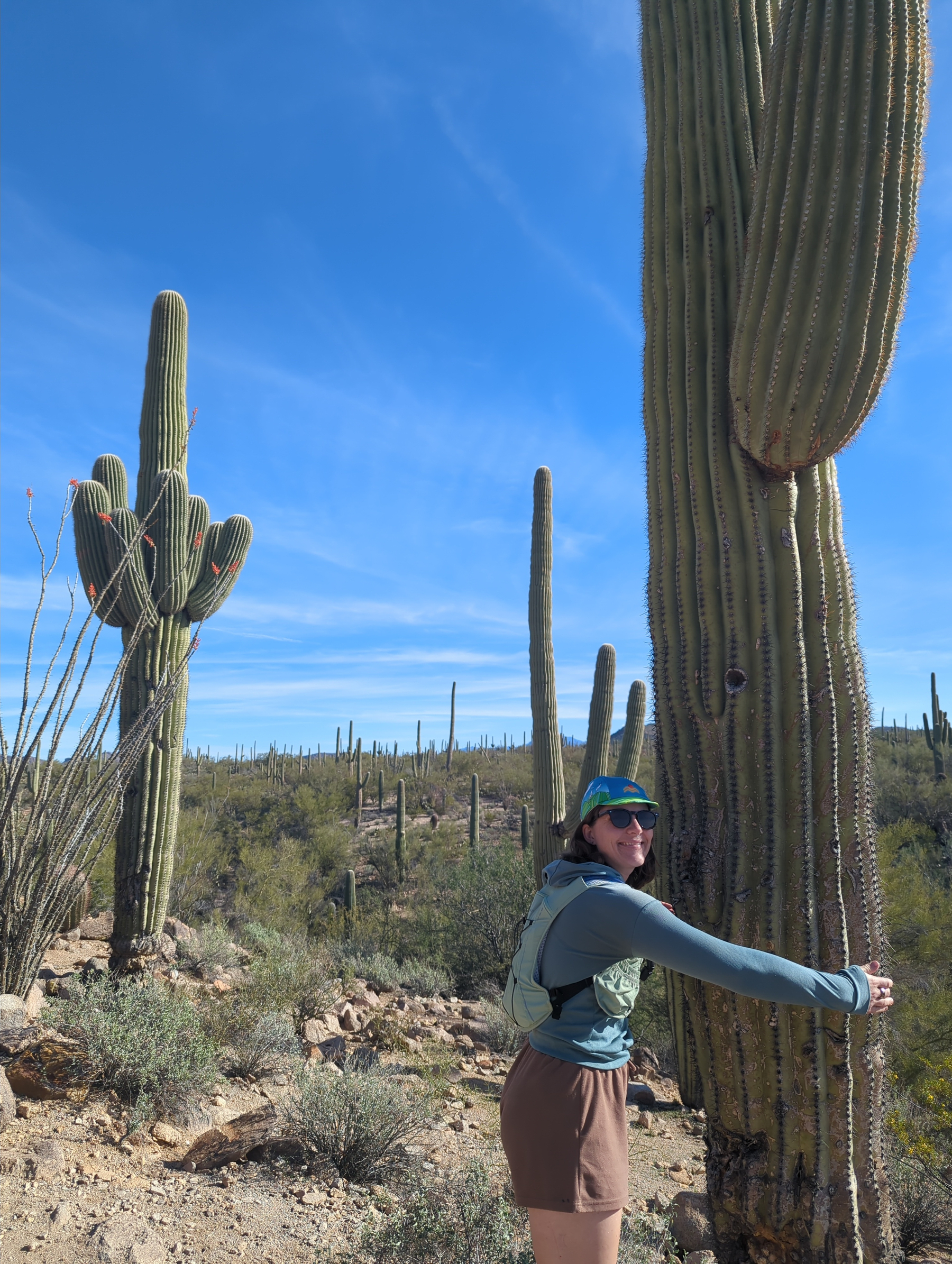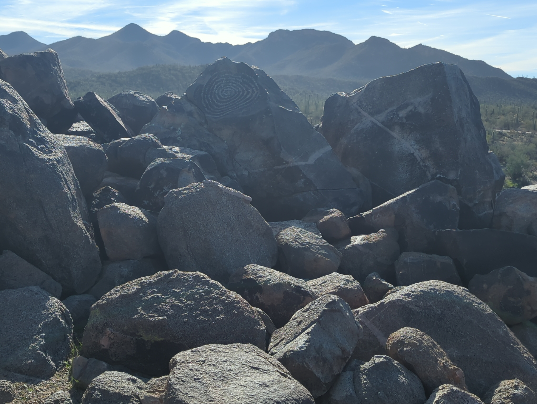 We got up and packed our gear back into the van, deciding to indulge on a town day. Before heading into the city, we explored the west zone of Saguaro National Park. We hiked up a hill to view ancient Hohokam petroglyphs and looked back across the valley at the range where we had camped the night before.