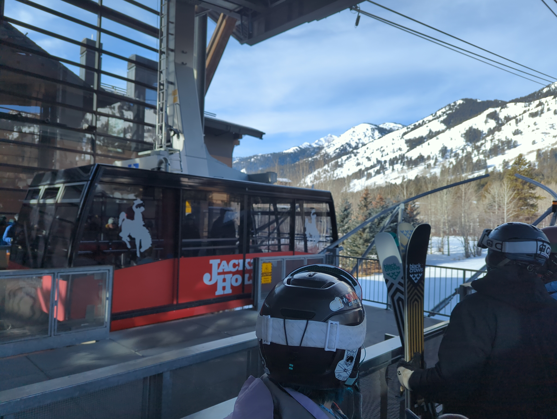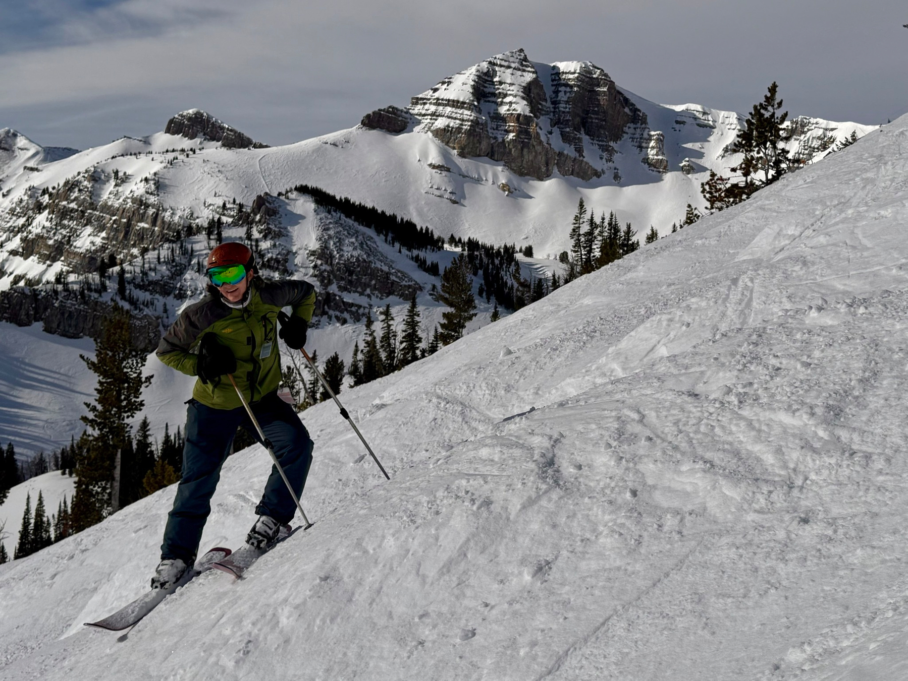 Our first morning started with a trip up Jackson’s legendary tram. With 80s hair rock blaring over the loudspeakers and dozens of people packed in, it felt like being in a ski movie. Reaching the summit, we got a bird’s-eye view of iconic Corbet’s Couloir. It was closed for an upcoming competition, but staring down into that narrow, steep gully was enough to get the adrenaline pumping.
