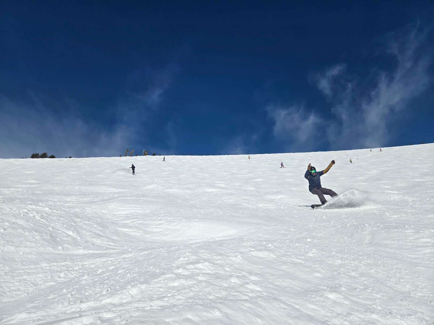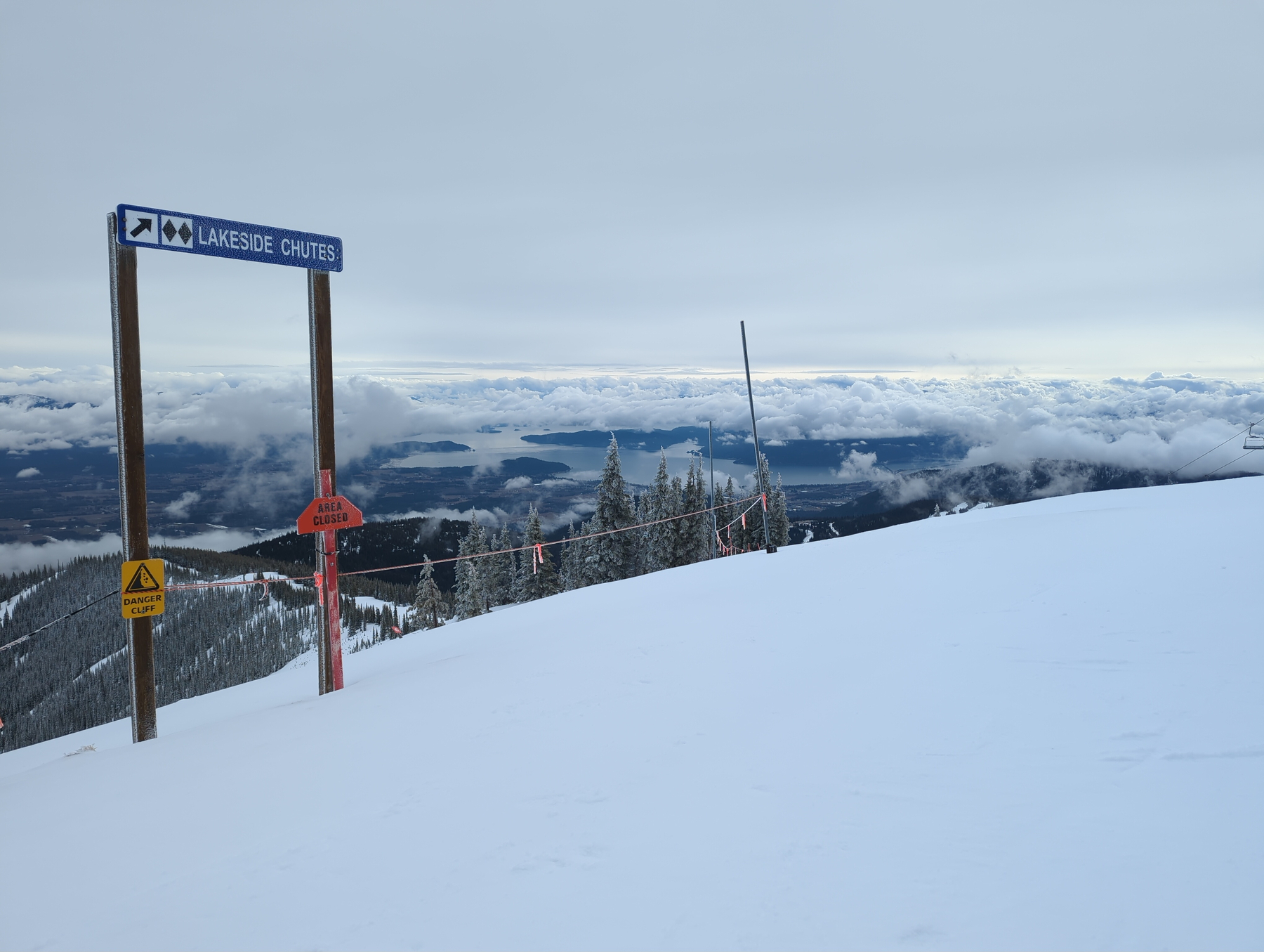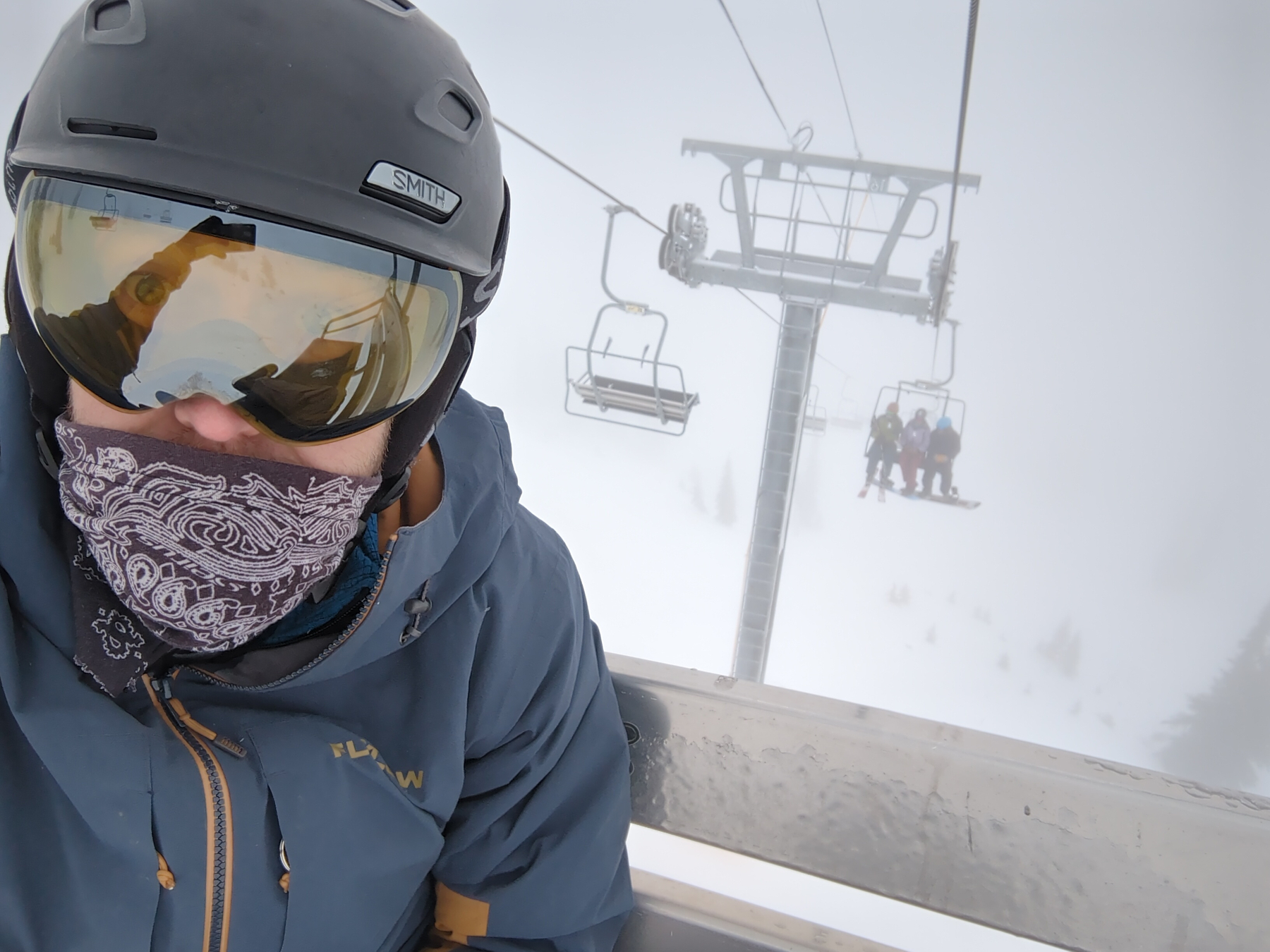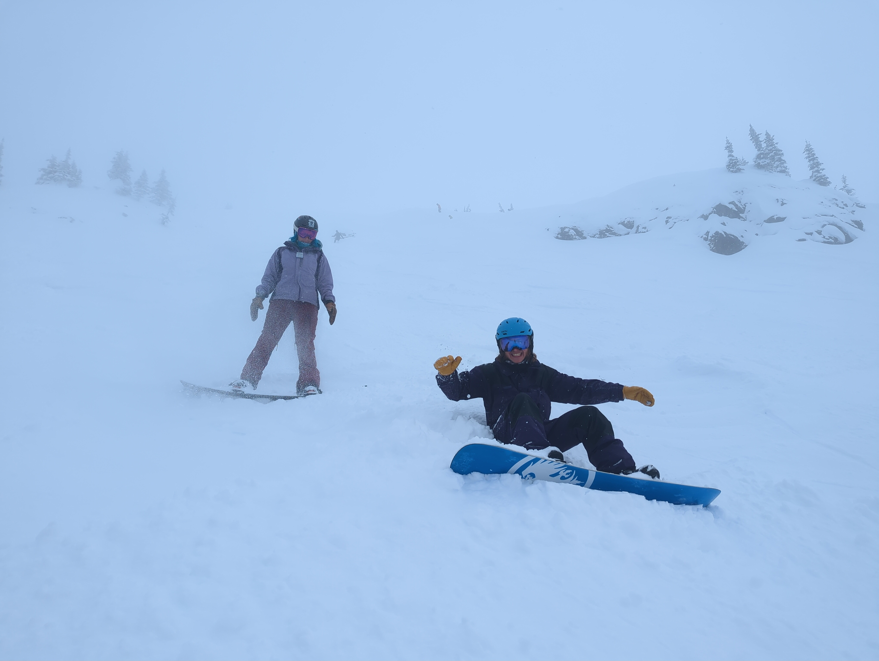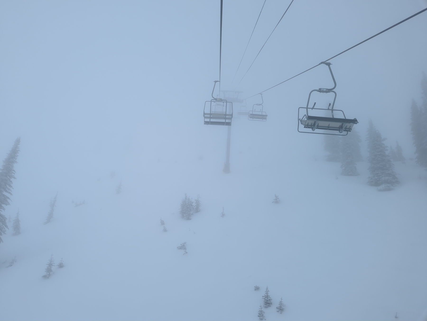 The morning didn’t bring the “reset” we hoped for. We found the mountain buried under a heavy fog and an “exciting” layer of breakable crust over soft snow. It was brutal… the kind of snow that grabs your board or skis mid-turn and refuses to let go. On the bright side, through the fog we were able to see down to Sandpount and the lake from different parts if the mountain, which made for some unique scenes.