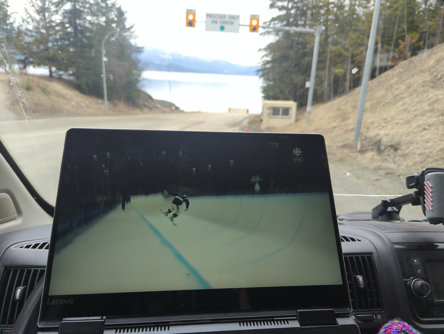 The next morning, we missed the lakeside ferry by a mere eight minutes. In true modern nomad fashion, we didn’t stress; we just popped the Starlink on the roof and watched the Olympics men’s snowboard halfpipe finals while waiting for the next boat.
