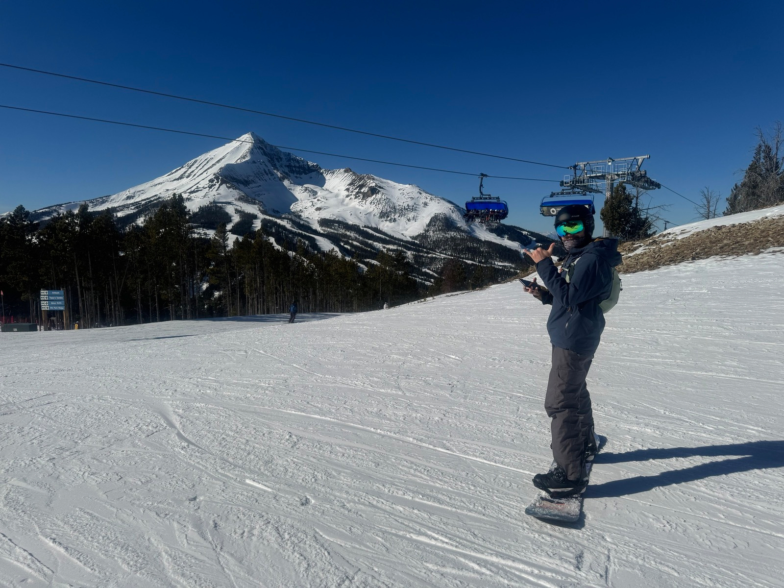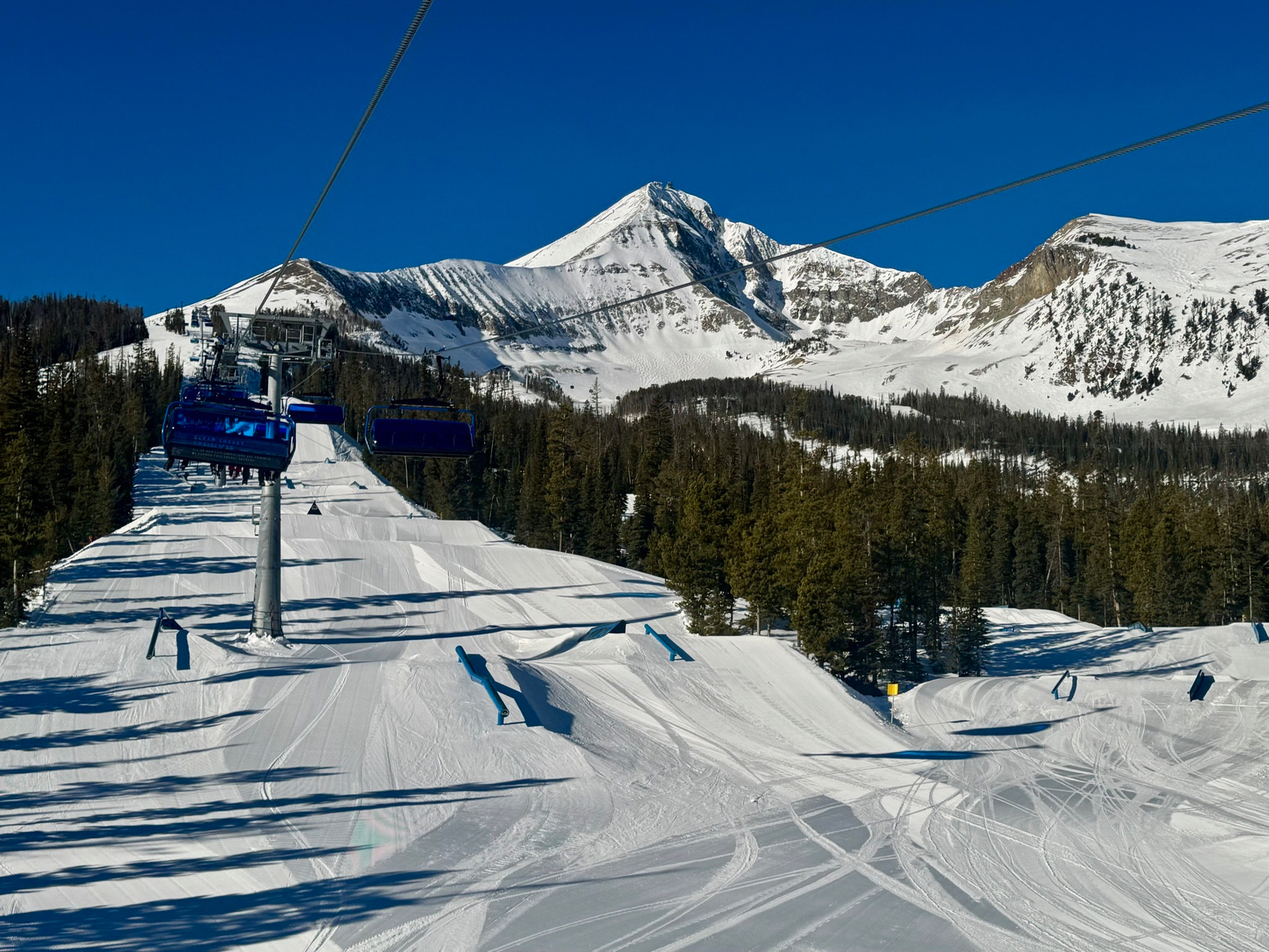 We woke up to a crisp 22 degrees inside the van, a reminder that winter camping isn’t for the faint of heart. Luckily we have plenty of blankets! After cranking the heater and defrosting, we headed to the resort. Big Sky makes a hell of a first impression: it took 15 minutes on the highway to drive from one end to the other, the “shuttles” are actually Rivian electric trucks pulling 15-passenger trailers, and the lifts feature heated seat cushions and wind-blocking bubbles.