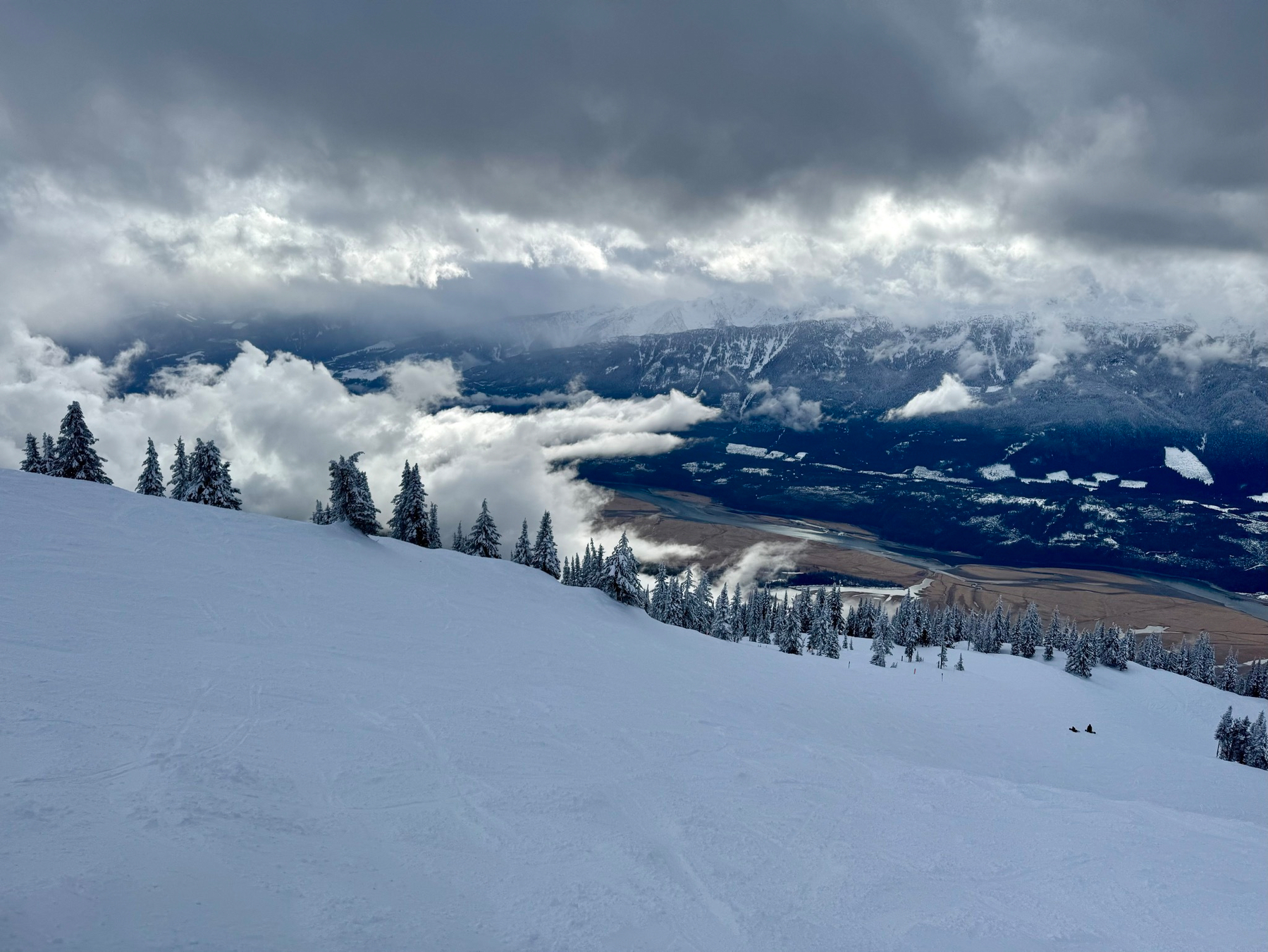We caravanned across the border and (funny enough) through a town called Creston, eventually climbing over a massive mountain pass that gave us our first promising sign: loooots of snow. We descended into the valley and hit Trail, BC, a surprisingly industrial town where Rose and I did a mandatory restock at a Canadian grocery store. We emerged with a stash of Canadian snacks and a six-pack from Vancouver, ready for the next resort.